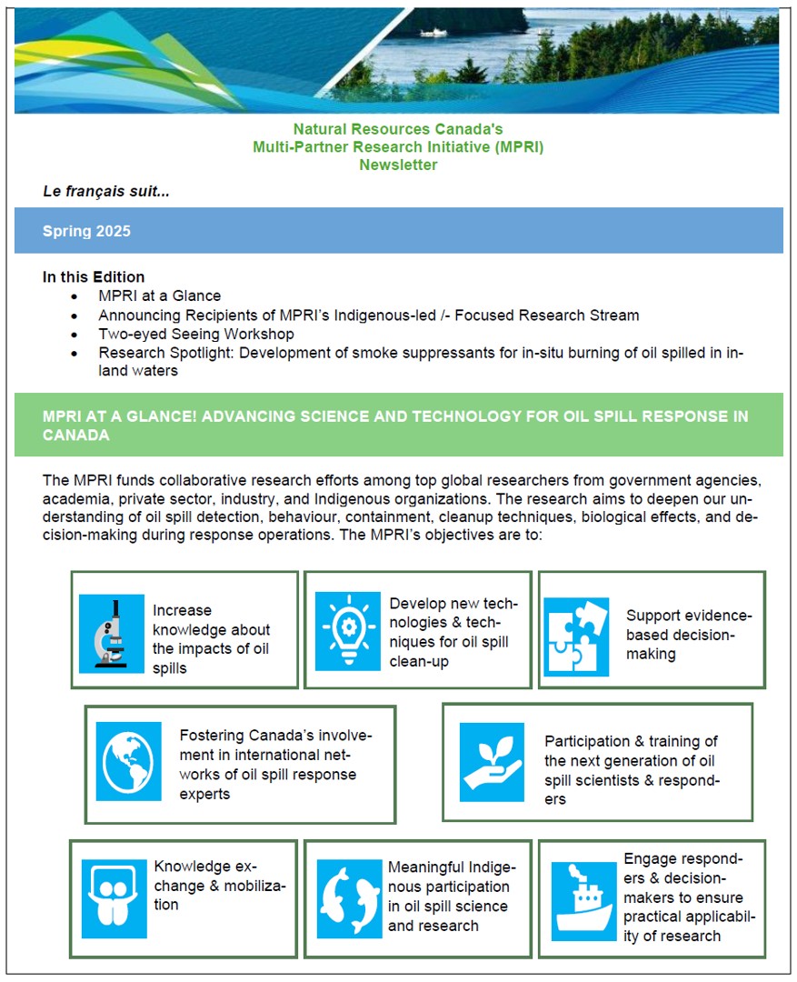 Established in 2017 under Canada’s Oceans Protection Plan and renewed in 2022, Canada’s Multi-Partner Research Initiative (MPRI) brings together international researchers and knowledge holders to advance research and technology innovation in support of evidence-based decision making for improved oil (and alternative fuel) spill response.