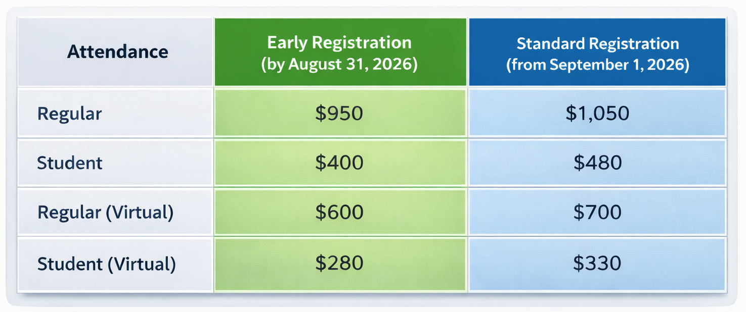 *In-person sessions include lunch and coffee breaks. *Banquet option on October 15: Regular $150, Student $90. *Post-conference 3-hour city tour (classic route): $30. *All prices are based on Canadian Dollars ($CAD) and local sales tax will be applied. *Financial assistance toward registration costs for Indigenous participants may be available upon request.