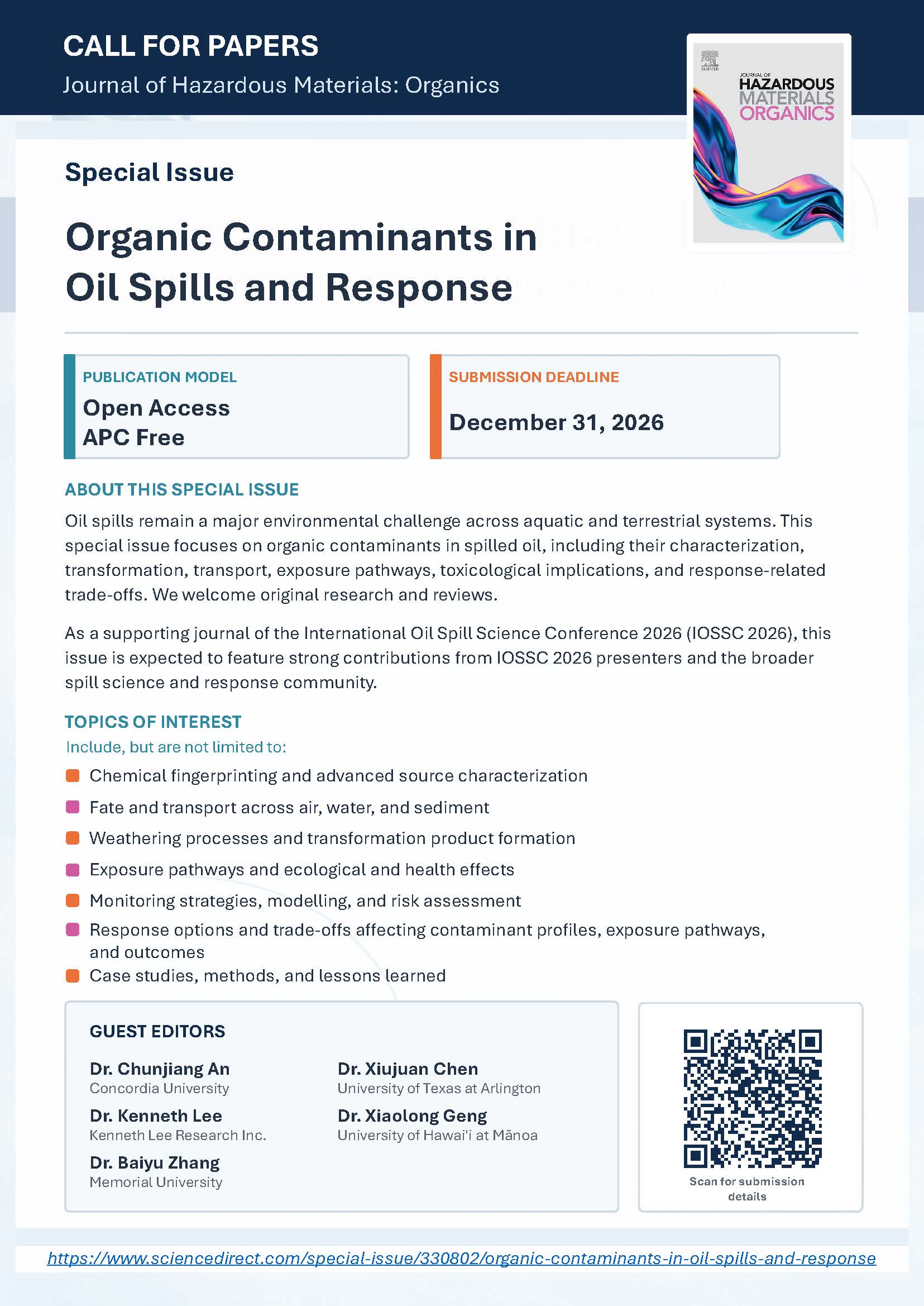 Oil spills remain a major environmental challenge across aquatic and terrestrial systems. This specialissue focuses on organic contaminants in spilled oil, including their characterization, transformation, transport, exposure pathways, toxicological implications, and response-related trade-offs. We welcome original research and reviews.